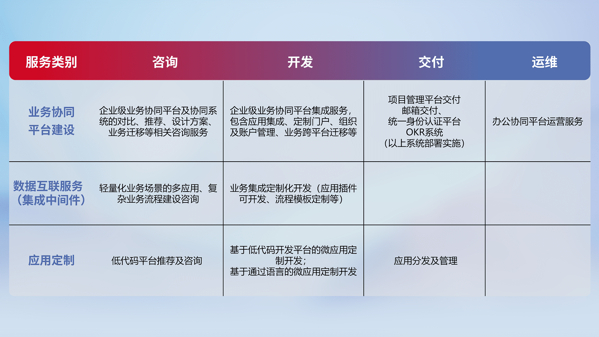 针对钉钉、、、、企微、、、IDaas等平台级产品提供产品的规划、、方案、、、、交付、、、定制化开发等服务,,,,实现如统一协同办公、、智能客户服务、、混合会议管理、、智能数据查询、、、等业务场景,,实现数字化转型。。